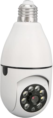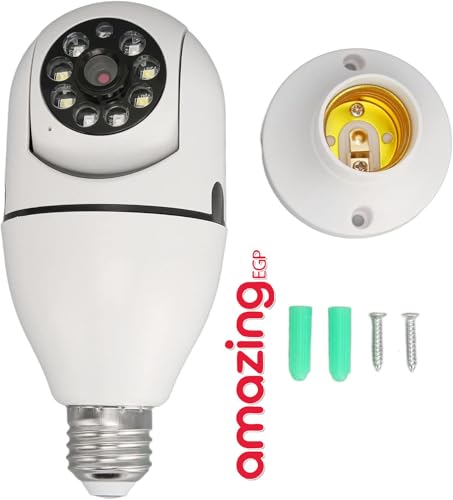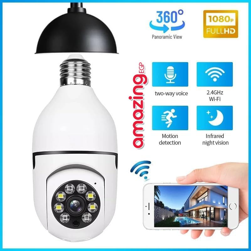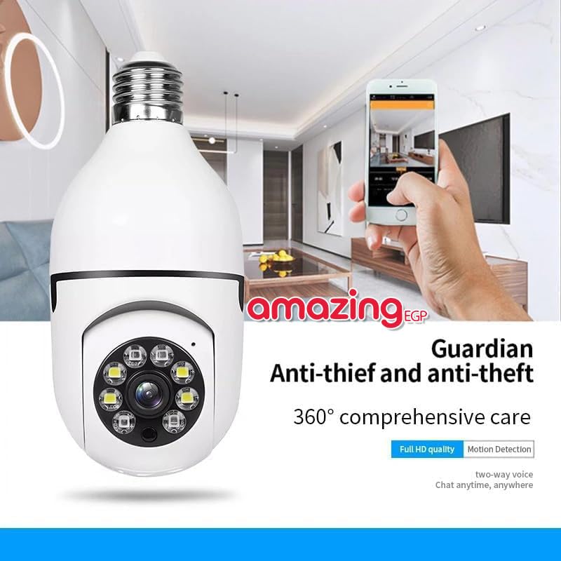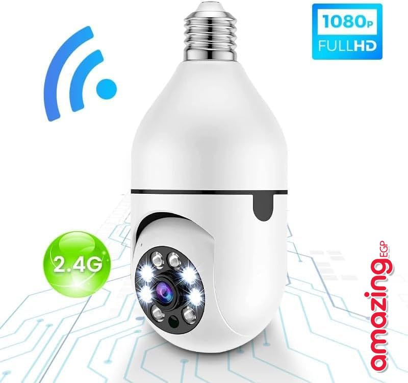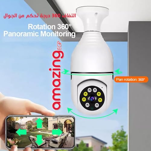 كاميرا مراقبة بمصباح إضاءة بخاصية واي فاي ودوران 360 درجة، دقة عالية HD 1080P، مقبس E27، تقنية كشف الحركة، صوت ثنائي الاتجاه، رؤية ليلية، للاستخدام الداخلي والخارجي، مقاومة للماء IP65 من ذا باك، أبيض