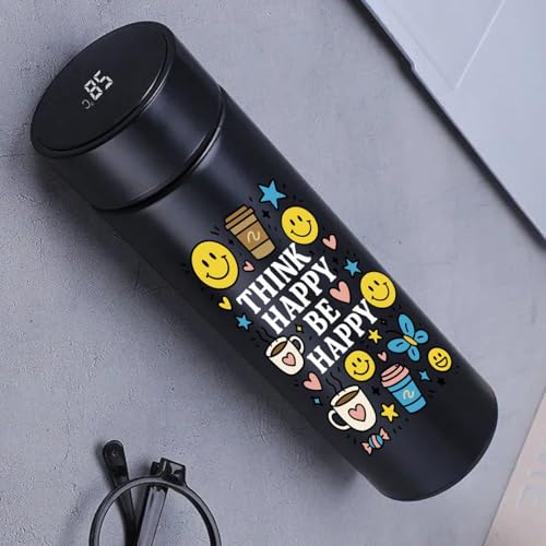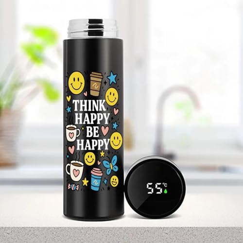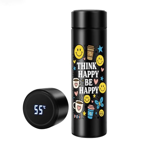 Generic - مج حراري بشاشة ليد تعمل باللمس باللون الاسود هدية للنساء، ملصق مقاوم للماء بطباعة على جهة واحدة وتصميم تحفيزي بعبارة "Think happy be happy" هدايا مميزة نطبعها لك