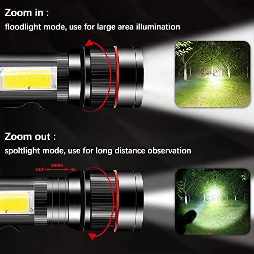 - 3 modes and zoomable: LED torch rechargeable with 3 modes (highlight, strobe, COB side light) by briefly pressing the switch to change the mode. The torch lighting distance is 500 metres to meet the requirements of most scenes. Adjustable focus that enlarges or reduces the design. You can also choose wider light (floodlight) or narrower light (spotlight) for different applications.