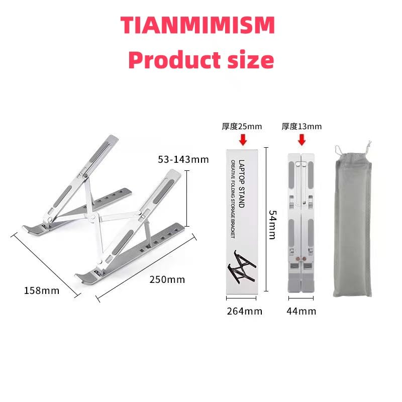 TIANMIMISM - Adjustable Laptop Stand, Aluminum Foldable Computer Riser, 10-15.6 Inch, Ergonomic Design with Storage Bag, Silver