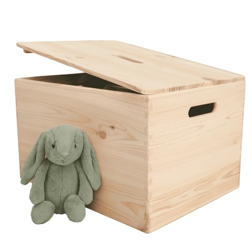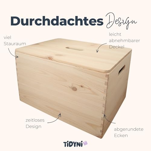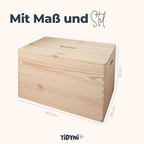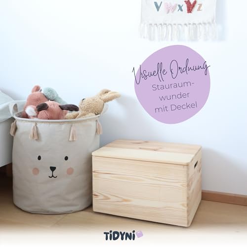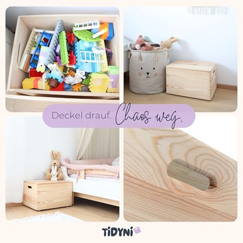 TIDYNI - صندوق العاب من خشب الصنوبر من تيديني مقاس 40 × 30 × 23 سم مع غطاء، تخزين العاب جميل وعملي (معتمد من اف اس سي)