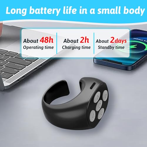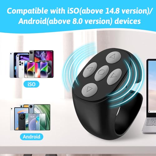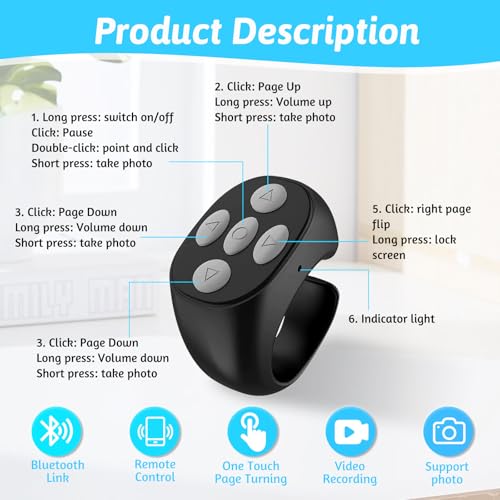 - ريموت كنترول يعمل بأطراف الأصابع: بفضل تقنية البلوتوث المتقدمة، تتيح لك حلقة التمرير اللاسلكية تنفيذ مهام مثل قلب الصفحات، الإعجاب بالمحتوى، وإيقاف الفيديوهات مؤقتًا دون لمس الهاتف، لتمنحك تجربة استخدام سلسة وبدون استخدام اليدين.