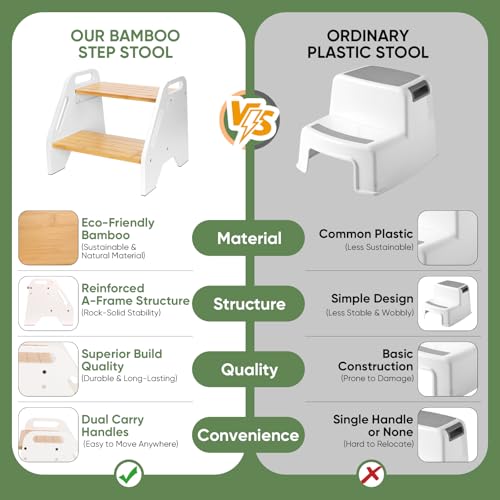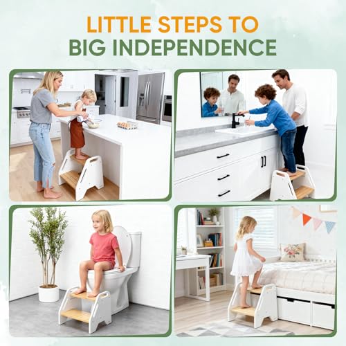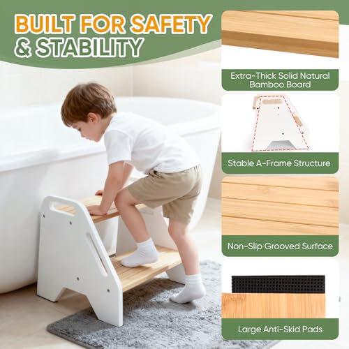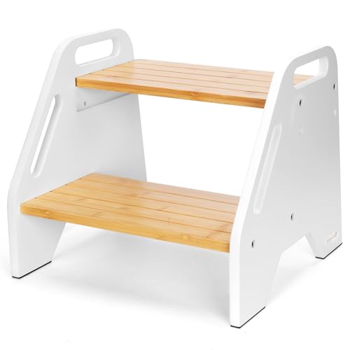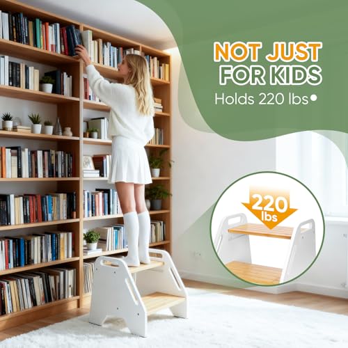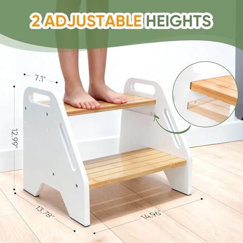 Timberfolkfz - Kids Step Stool Height Adjustable- White-Natural Color Bamboo 2 Heights Stool with Non-Slip Pads, 220lbs Capacity, Safe for Kids & Elderly - Kitchen, Bathroom, Home