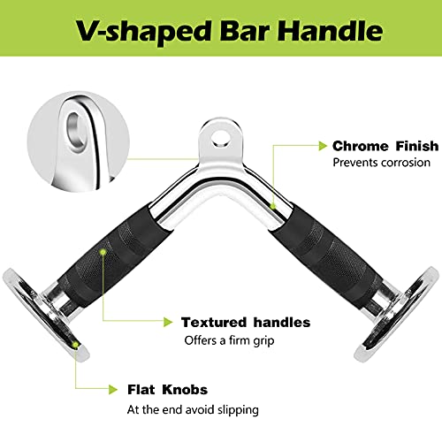 - V Shaped Bar (Double D Handle) & V Handle: Constructed of high-quality Iron with polished plating finish to prevent rust. Double Row Handle can support up to 880lbs (400 kg). 0.5 inch hole can fit easily for all cable system; provides a balanced force to both arms when attach it to any gym machine