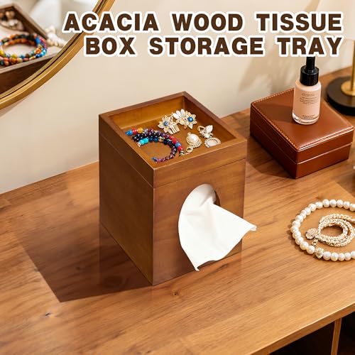 SeekElegant - Tissue Box Cover Square with Storage Tray, Acacia Wood Tissue Box Holder, Decorative Cube Wall-Mounted Tissue Holder for Desktops, Nightstands, Bathrooms, and Offices, Modern Home Decor