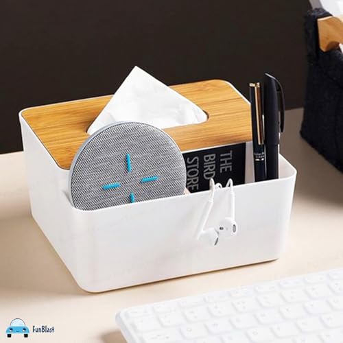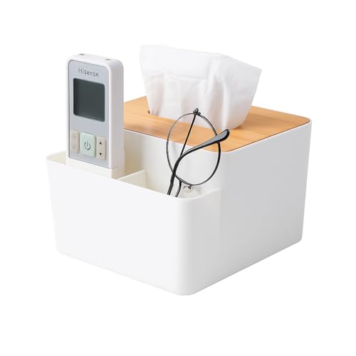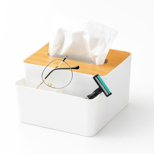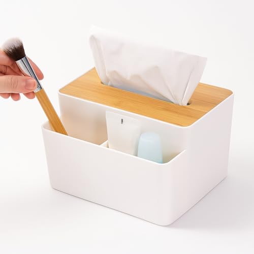 Plan A - حامل علبة مناديل مع مساحة تخزين، صندوق مناديل بلاستيكي بغطاء خيزران طبيعي أنيق، موزع مناديل ورقية متعدد الأغراض للطاولة، مناسب للمنزل والمكتب وغرفة النوم والسيارة