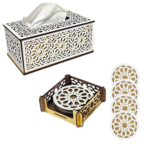 Woodiano - Tissue Box Holder, Wooden Decorative Tissue Box Cover for Kitchen, Bedroom, Living Room, Office + 4 Wooden Coasters for Cups & Coasters Holder