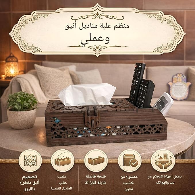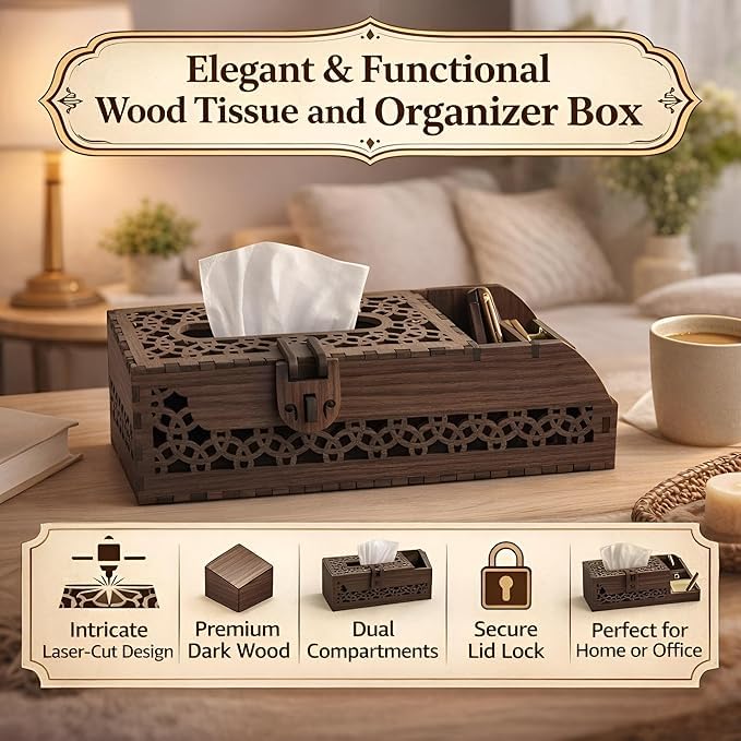 - Wooden tissue box cover designed to end the daily search for tissues and remotes, keeping everything neat in one stylish place on your table or sofa.