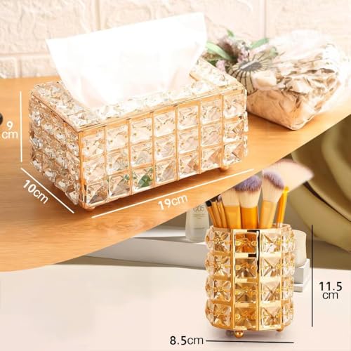 Generic - علبة تخزين المناديل مع 2 تصميم كريستالي ذهبي لامع وحامل فرش مكياج كريستالي مطابق - منظم انيق