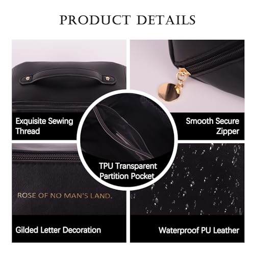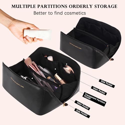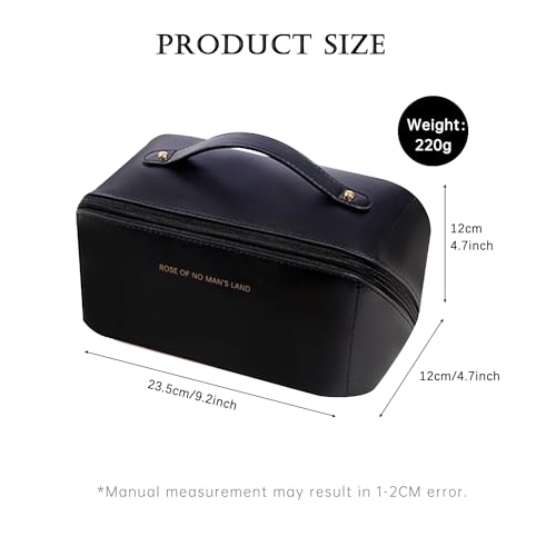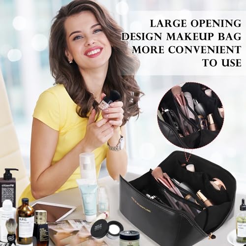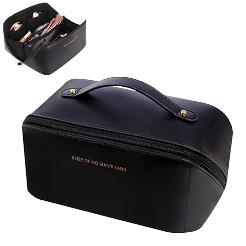 Tmerri Jw - Large Capacity Travel Makeup Bag for Women Waterproof Portable Pouch Open Flat Toiletry Bag PU Leather Cosmetic Bag Organizer with Divider and Handle Black, Black, Fashion