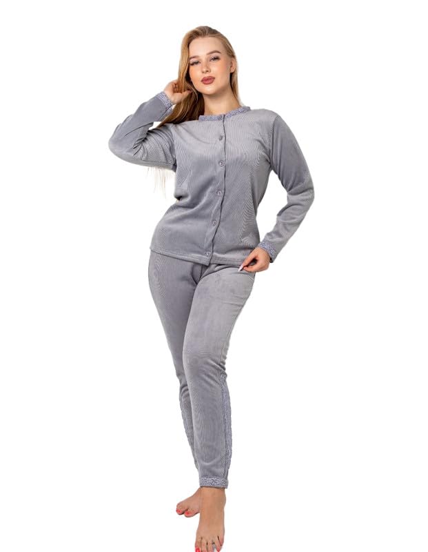 TN - TN Fashion Women’s Velvet Pajama Set – Long Sleeve Button-Down Sleepwear Size Large - Grey - Winter pajama