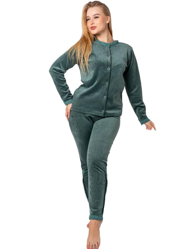 TN - TN Fashion Women’s Velvet Pajama Set – Long Sleeve Button-Down Sleepwear Size Medium - Green - Winter pajama