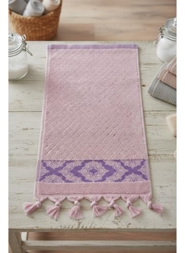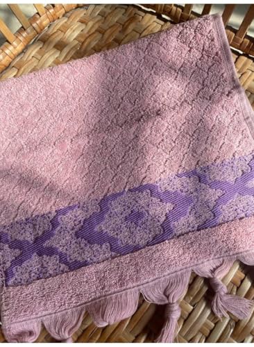 generic - طقم مناشف يد وردي من 3 قطع من توالا، مقاس 30 × 50، بحواف ارجوانية مزخرفة وتفاصيل شراشيب، لطيفة وممتصة وتضيف لمسة انيقة لأي حمام.