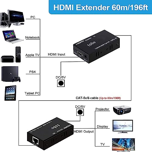 Tobo - وصلة تمديد HDMI من توبو، جهاز استقبال RX وجهاز إرسال TX بطول 60 متر، جهاز تقوية إشارة HDMI على منفذ فئة 5e/6، يدعم مخرج فيديو حتى 1080p/720p/480p، ثلاثي الأبعاد