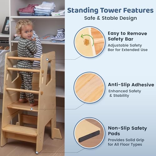 - ADVANCED SAFETY FEATURES: The toddler standing tower features a secure safety rail at the back with easily detachable safety bars featuring knob screws. Additionally, six anti-slip strips prevent accidental slips, providing complete protection for your child.