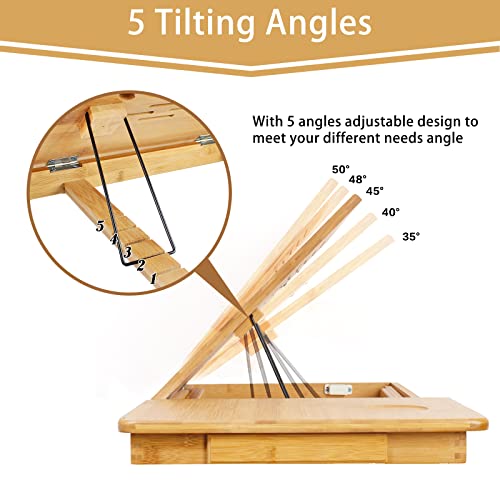 - تصميم عملي - تحتوي صينية اللاب توب هذه على 5 فتحات زوايا إمالة للحفاظ على اللاب توب أو الكتاب في الزاوية المثالية؛ يسمح لك التصميم المجوف على شكل مروحة لمكتب اللاب توب بتبديد الحرارة بسرعة عند استخدام المنتجات الإلكترونية؛ الحاجز المدروس المضاد للانزلاق وأخدود الكوب الموفر للقلق يمكن أن يمنع بشكل فعال الكمبيوتر والكتاب وكوب الماء من الانزلاق؛ مصمم بدرج جانبي لتخزين الأقلام وUSB والماوس وما إلى ذلك.