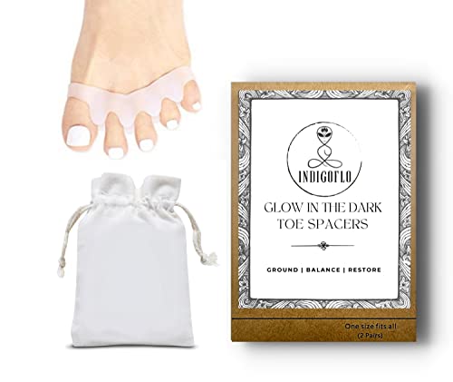 INDIGOFLO - Toe Separators to Correct Toes & Relieve Pain Naturally, Glow in The Dark, Bunion Corrector, Hammer Toe Relief, Spacers for Yoga and Wide Toe Box Shoes | Universal Size - 2 Pairs With Drawstring Bags