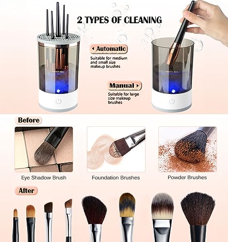 - Electric make-up brush cleaner: UV sterilization, deep and gentle cleaning, easily remove dirt without damaging the makeup brush. The electric makeup brush cleaner has 2 modes. Automatic mode allows you to clean multiple brushes at the same time. Manual mode is suitable for foundation and concealer brushes.