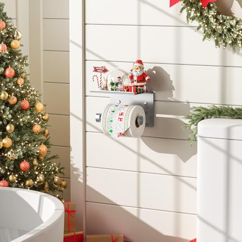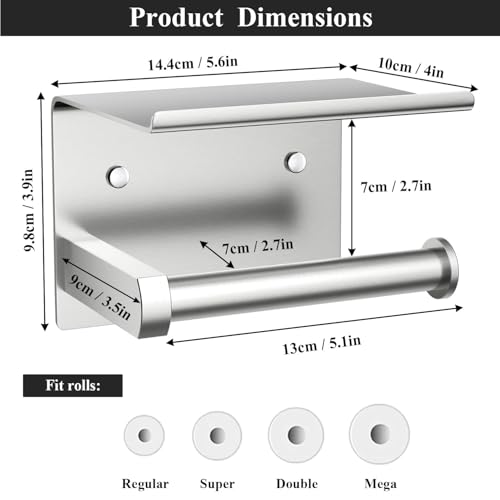 BTTERROOM - Toilet Paper Holder with Phone Shelf 304 Stainless Steel Wall Mounted Toilet Paper Roll Holder - Rustproof and Bathroom Washroom Tissue Roll Holder with Storage Shelf - Silver