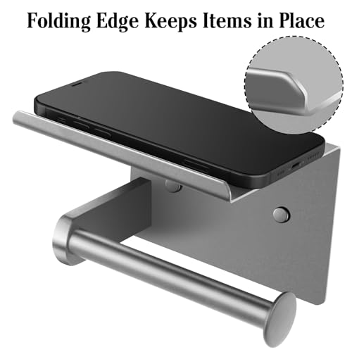 - حامل ورق التواليت مع رف - يمكن وضع حامل ورق المرحاض المثبت على الحائط في الحمام أو الحمام. يسمح لك رف التخزين الكبير لحامل ورق المرحاض الفضي غير اللامع بوضع بعض ملحقات الحمام مثل الجوال والنباتات الصغيرة والمفاتيح والساعات والنظارات والمناديل المبللة ومعطر الهواء. تصميم أمامي خاص قابل للطي لحامل ورق المرحاض لمنع انزلاق كل ما تضعه.
