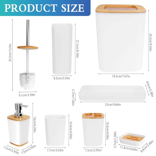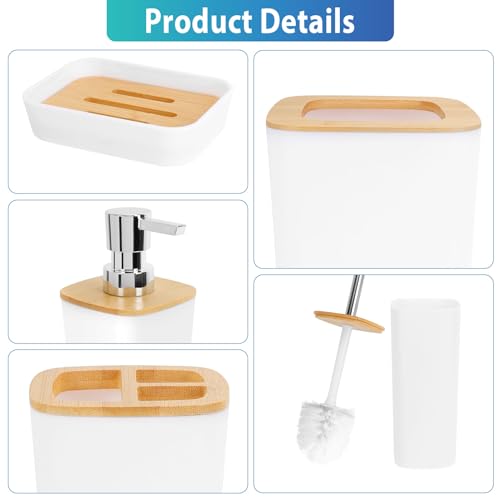 - Simple Design: The appearance is simple and elegant, Made of Simple white PP and bamboo color, form a natural element for the bathroom, making your bathroom more clean and tidy. This bathroom sets accessories bring an elegant quality to your whole bathroom.