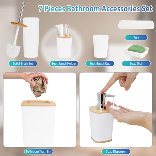 TOOSII - TOOSII 7 Pieces Bathroom Accessories Set, Luxury Plastic Bathroom Accessories Set Bamboo Cover, Bathroom Bin and Toilet Brush Set with Soap Dispenser, Toothbrush Cup, Toothbrush Holder, Soap Dish, Tra