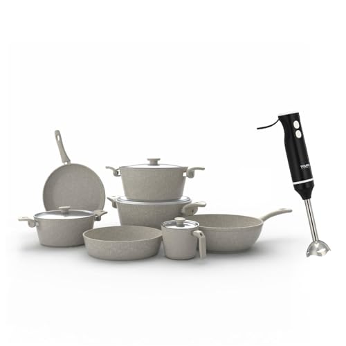 Top Chef - طقم أواني الطبخ من توب شيف، مصنوع من الجرانيت باللون البيج، غير لاصق وآمن في غسالة الصحون ومتوافق مع الحث، يتكون من 11 قطعة