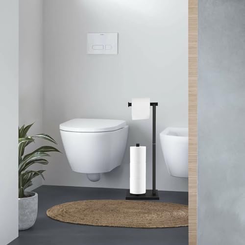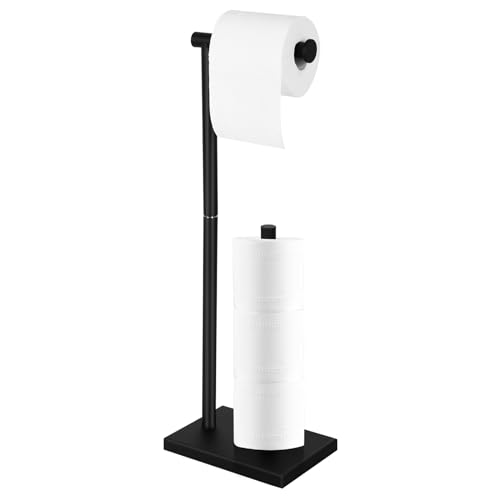- Large capacity - Holds 4 rolls of toilet rolls. Freestanding toilet paper holder with storage can dispenses one roll of paper and holds three spare roll of paper. This toilet paper storage stand is compatible with many sizes of rolls.