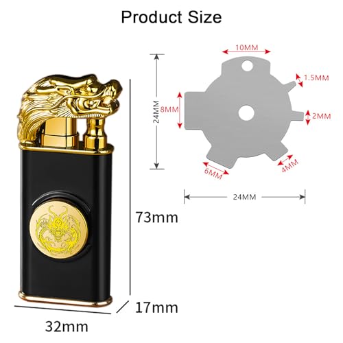 - تصميم أنيق ومتين ـ مصنوع من معدن متين لأداء يدوم طويلًا وتتميز بتصميم تنين محفور معقد للحصول على مظهر فاخر وقابل للتجميع. حجم صغير (73 × 32 × 17 ملم) يناسب بشكل مريح اليد أو الجيوب أو الشنط ـ رائع للسفر والاستخدام اليومي المحمول والمغامرات الخارجية.