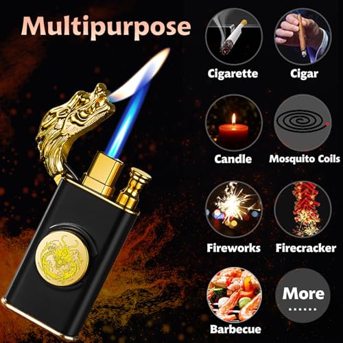 - 🔥【وضعا شعلة ساحران】بعد الضغط على الزر لإشعال اللهب وتحرير إصبعك، سيخرج اللهب من فم التنين حتى تغلق الولاعة. مقاومة للرياح والماء، تولد نار زرقاء نفاثة مباشرة ونار مفتوحة، بعدد أوضاع إجمالي وضعان للهب.