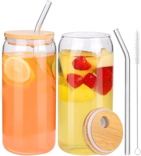 Toriseek - أكواب زجاجية شفافة مع أغطية من الخشب وشفاطات من توريسيك، كوب للقهوة الباردة سعة 473 مل، كوب شرب بأغطية خشبية للمشروبات والكوكتيل والشاي واللاتيه (عبوة من قطعتين)