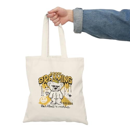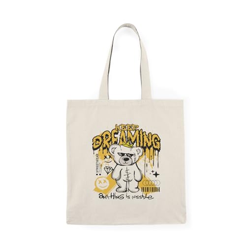 Generic - Tote Bag - Beige Canvas Zipper Bag Keep Dreaming Bear Doll Tote Bag With Zipper