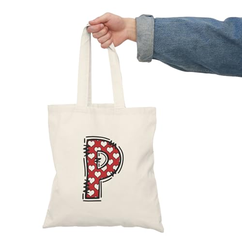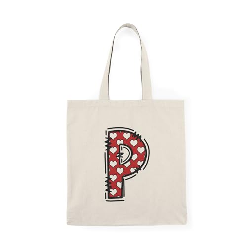 Generic - Tote Bag – شنطة قماش بسحاب - تصميم حرف P المزين بالقلوب - تصميم مخصص للهدايا الشخصية والأسماء لهدايا عيد الحب – حقيبة واسعة وخفيفة للتسوق اليومية – حقيبة عملية صديقة للبيئة وقابلة لإعادة الاستخدام