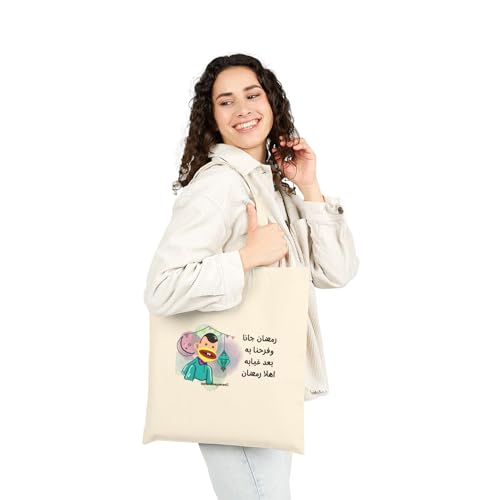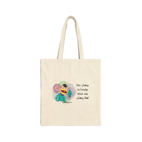 Generic - Tote Bag - حقيبة قماشية بسوسته بتصميم كرتوني لشخصية بوجي مع كلمات "رمضان جانا وفرحنا به" - شنطة كتف قطنية تراثية لهدايا رمضان، أبيض كريمي متين وعصري.
