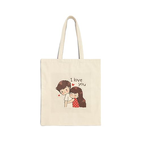 Generic - Tote Bag - حقيبة قماشية بسوسته بتصميم كرتوني لثنائي لطيف وعبارة "I Love You" - شنطة كتف قطنية رومانسية لهدايا عيد الحب والذكرى السنوية، أبيض كريمي متين..