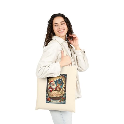 Generic - Tote Bag - حقيبة قماشية بسوسته بتصميم "Merry Christmas" سانتا كلوز ورنة الكريسماس في مشهد ثلجي فني - شنطة كتف قطنية لهدايا الميلاد، أبيض كريمي وعصري.