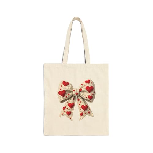 Generic - Tote Bag - حقيبة قماشية بسوسته بتصميم فيونكة كروشيه وقلوب حمراء - شنطة تسوق قطنية أنيقة ورومانسية.