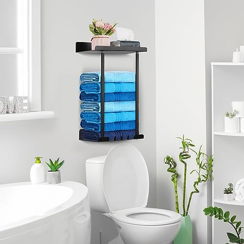 - 🛀【Quality materials】Our black towel storage wall mounted with shelf is made of high quality stainless steel with matte black coating, lightweight but moistureproof, corrosion-resistant and rust-free. Durable construction with elegant finish and easy to clean. Suitable for humid environments such as the bathroom and kitchen.