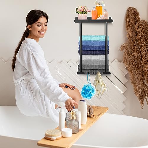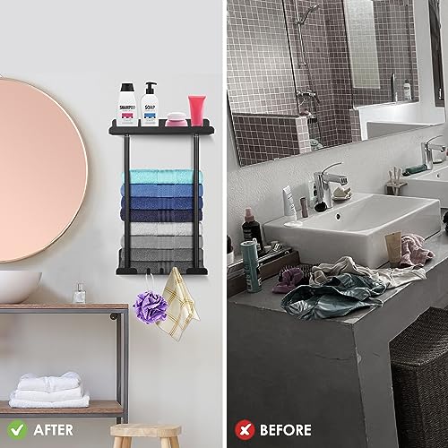 autumndeer - Towel Rack Wall Mounted, Bath Towel Racks with Shelf, Bathroom Towel Storage can Hold Large Bath Sheets, 2 Bar Rail Bathroom Towel Holder, Rolled Salon Black Towel Shelf Organizer for Small Bathroom