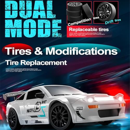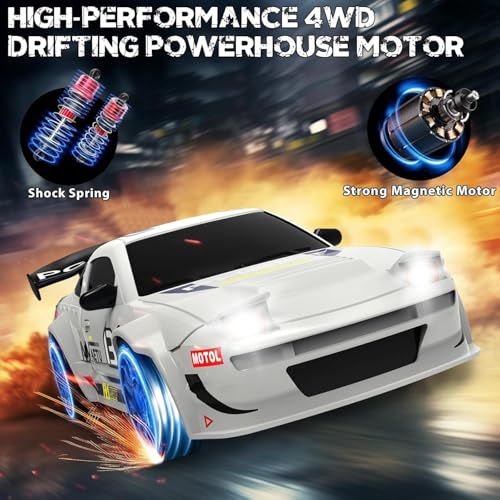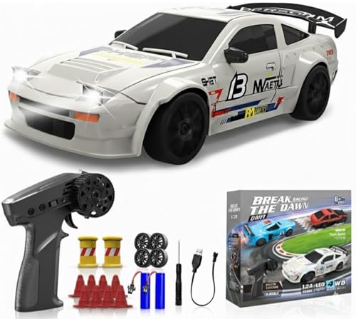 TOYS LAND - سيارة انجراف تعمل بجهاز تحكم عن بعد بمقياس 1:24 من تويز لاند، سيارة سباق رباعية الدفع عالية السرعة 17 كم/ساعة، اطارات اضافية، مصابيح LED، بطاريتان قابلتان لاعادة الشحن، لعبة سيارة رياضية للبالغين
