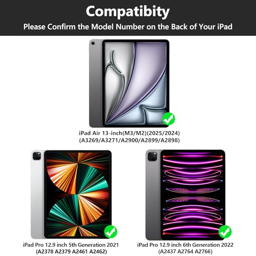 - COMPATIBILITY: This iPad bluetooth keyboard is Compatible with iPad Air 13-inch (M2) 2024(Model:A2900/A2899/A2898), iPad Pro 12.9 inch 6th Generation 2022(Model:A2437/A2764/A2766), iPad Pro 12.9 inch 5th Generation 2021(Model:A2378/A2379/A2461/A2462) Please check your iPad model before purchasing.