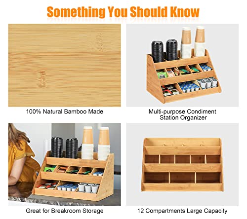 - 【Extra Space Provided】12 Compartments large condiment organizer, provide enough space for your countertop to storage k-cups, snack, tea bags, disposable coffees or any break rooms accessories; The top 4 compartments size is approximately 4.64”W x 3.85”D, which can hold up to 20oz(600ml) size disposable cups, greatly useful for parties and gatherings, of course this bamboo station is also fit for office, cafes and restaurant, even can be used as essential oils/nail polish holder;