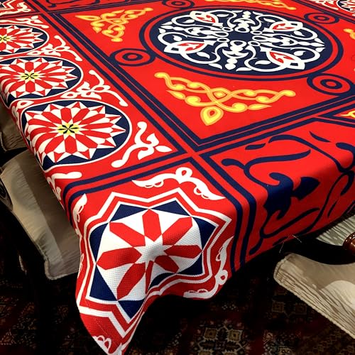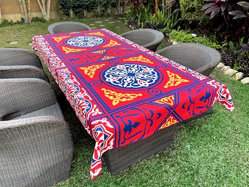 - TRADITIONAL DESIGN: Beautiful Khayameya Middle Eastern-inspired tablecloth featuring vibrant geometric patterns and medallions in red, blue, and yellow colours