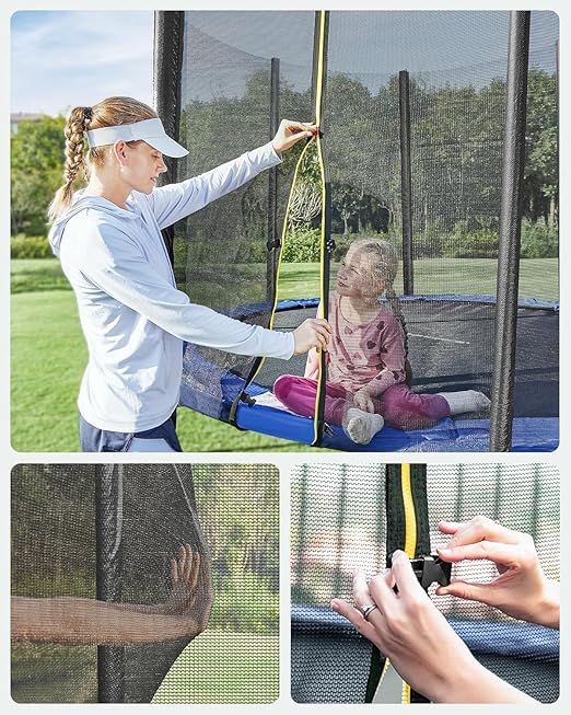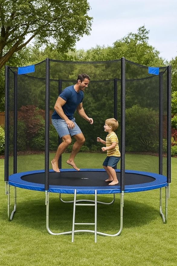 - Enjoy safe and exciting outdoor fun with this heavy-duty trampoline with safety net enclosure. Designed with a durable steel frame and weather-resistant jumping mat, it provides long-lasting performance for year-round use. The protective net and padded poles ensure maximum safety while kids and adults bounce with confidence. Perfect for backyards, this trampoline encourages active play, improves balance and coordination, and offers endless entertainment for the whole family.