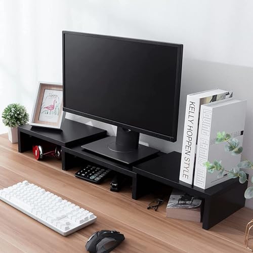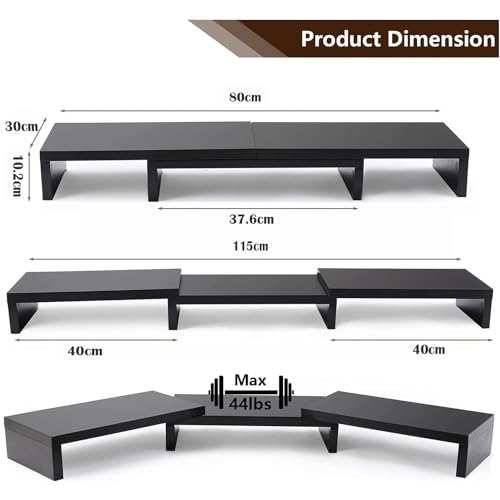 - PRODUCT PROFILE - 3 Shelf Monitor Stand Riser dimensions (80- 115) x 30 x 10.2 cm (L*W*H), great for home or office, suitable for monitors, laptops and TVs, also can be used as a shelf to hold books, manuals, magazines, desk accessories, framed photos, and so on. Total weight capacity up to 44 lbs.