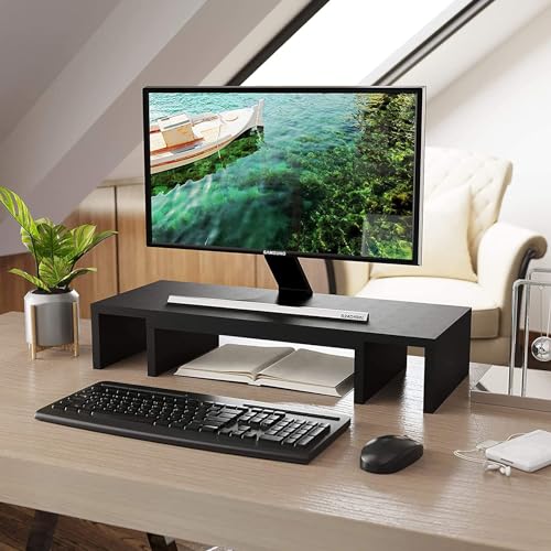 - SPACIOUS STORAGE UNDERNEATH - It elevates the monitors to comfortable viewing height 10.2cm, creates an additional large storage, allowing you to put your keyboard, mouse, DVD players, cell phones, iPad, tablets, sticky notes, business cards, and other desk accessories under the shelves, makes your workplace instantly spacious and tidy.