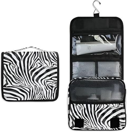 - Este neceser de viaje colgante presenta un llamativo estampado de cebra, combinando estilo y funcionalidad para usuarios que desean un organizador de cosméticos elegante y práctico en sus viajes.