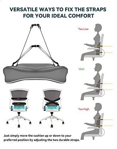 - أشرطة قابلة للتعديل وتثبت في مكانها: شريطان قابلان للتعديل مع مشابك تثبيت مرنة تمنع مخدة دعم أسفل الظهر من الانزلاق بطرق متعددة. على عكس مخدات دعم أسفل الظهر الأخرى المزودة بحزام واحد فقط أو بدون أي حزام، يمكنك دائمًا ضبط الارتفاع الأكثر راحة. يمكن أن تتمتد لأقصى طول وهو حوالي 1.45 متر، مما يجعل مخدة الظهر هذا مناسبًا لمعظم الكراسي مثل مقعد السيارة وكرسي المكتب وكرسي الكمبيوتر والكرسي بذراعين والكنبة والكرسي وما إلى ذلك.