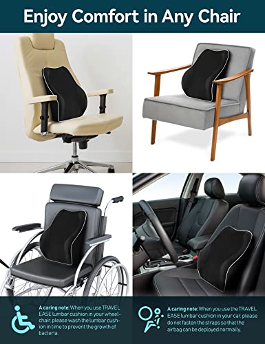 Travel Ease - مخدة دعم أسفل الظهر مريحة، دعم ظهر من الميموري فوم لمقعد السيارة وكرسي المكتب وكرسي الألعاب ومسند ظهر مع غطاء لطيف على البشرة وأشرطة مزدوجة قابلة للتعديل، أسود