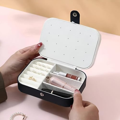 - NO MORE TEANGLES AND NECKLATCHES: The Travel Jewelry Box Ensures Your Jewelry Stay Organized and Prevents Necklaces from Tangling. Its lightweight compact design makes it easy to carry, featuring 7 holes and 3 rectangle compartments, plus space for earrings. This thoughtful design allows access to your jewelry without the hassle of on the go.
